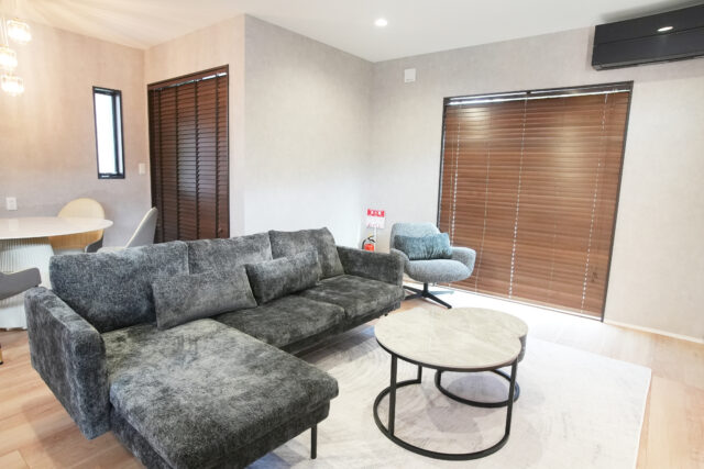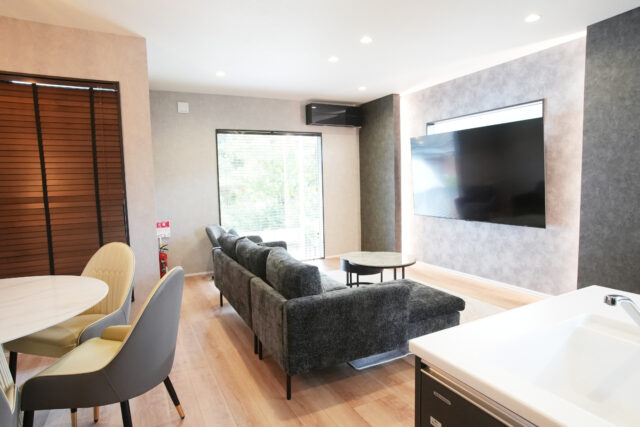 大型ソファと薄型テレビを設置。大きな窓からの採光を取り入れたお部屋で、家族やご友人どうしで、ゆったりと旅の疲れを癒しながら歓談を楽しむことができます。