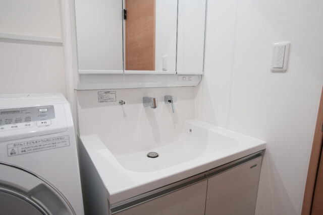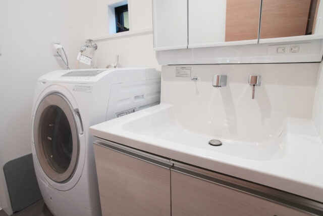 バスルームにはドラム式洗濯機を設置し、連泊に対応OK。ヘアドライヤーも完備。